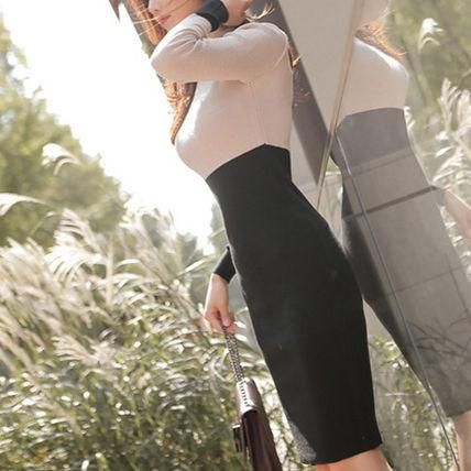 長袖 ツートン バイカラー クルーネック ミディアム タイトワンピース